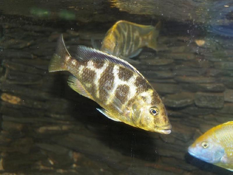 Действительно, это исключительно красивая и интересная рыбка семейства цихлид, по-научному золотого леопарда называют Nimbochromis venustus. Он не только красив, но и хитёр так же, как одноимённая кошка. Стоит только обратить внимание на уникальные методы его охоты — выработанная техника буквально на грани фантастики. Эта большая — двадцати пяти сантиметров длиной рыбка с красочными «жирафьего» рисунка боками вдруг пугает владельца, падая замертво где-нибудь на дне около грота. Неужто умерла?! Отчего?! Что случилось?! Но как только ничего не подозревающая мелкая рыбка, запущенная на корм, проявит любопытство и подплывёт поближе, золотой леопард атакует молниеносно и вновь становится живее всех живых. Точно так же охотится ещё одна цихлида — цихлида Ливингстона. Кстати, из-за окраса иногда название «леопард» меняют на название «жираф», но техника охоты всё-таки убеждает, что первое более точно — оно и стиль наряда, и стиль поведения характеризует одновременно.