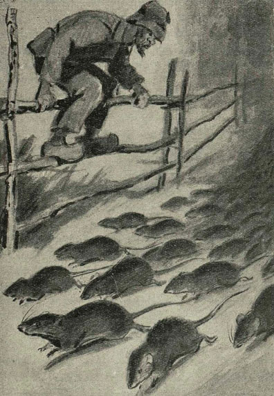 Часа через два после этого человек, шедший по уединенной проселочной дорожке, верстах в десяти от бывшей «крысиной» усадьбы, встретил шествие в его «походе». Он был неробкий человек, но «ночного похода» крыс нужно беречься и давать ему дорогу. И он дал дорогу крысиной процессии, сам вскарабкавшись поскорее на ближний плетень. Отсюда он и наблюдал живой поток крыс, катившийся внизу, под самыми его ногами.