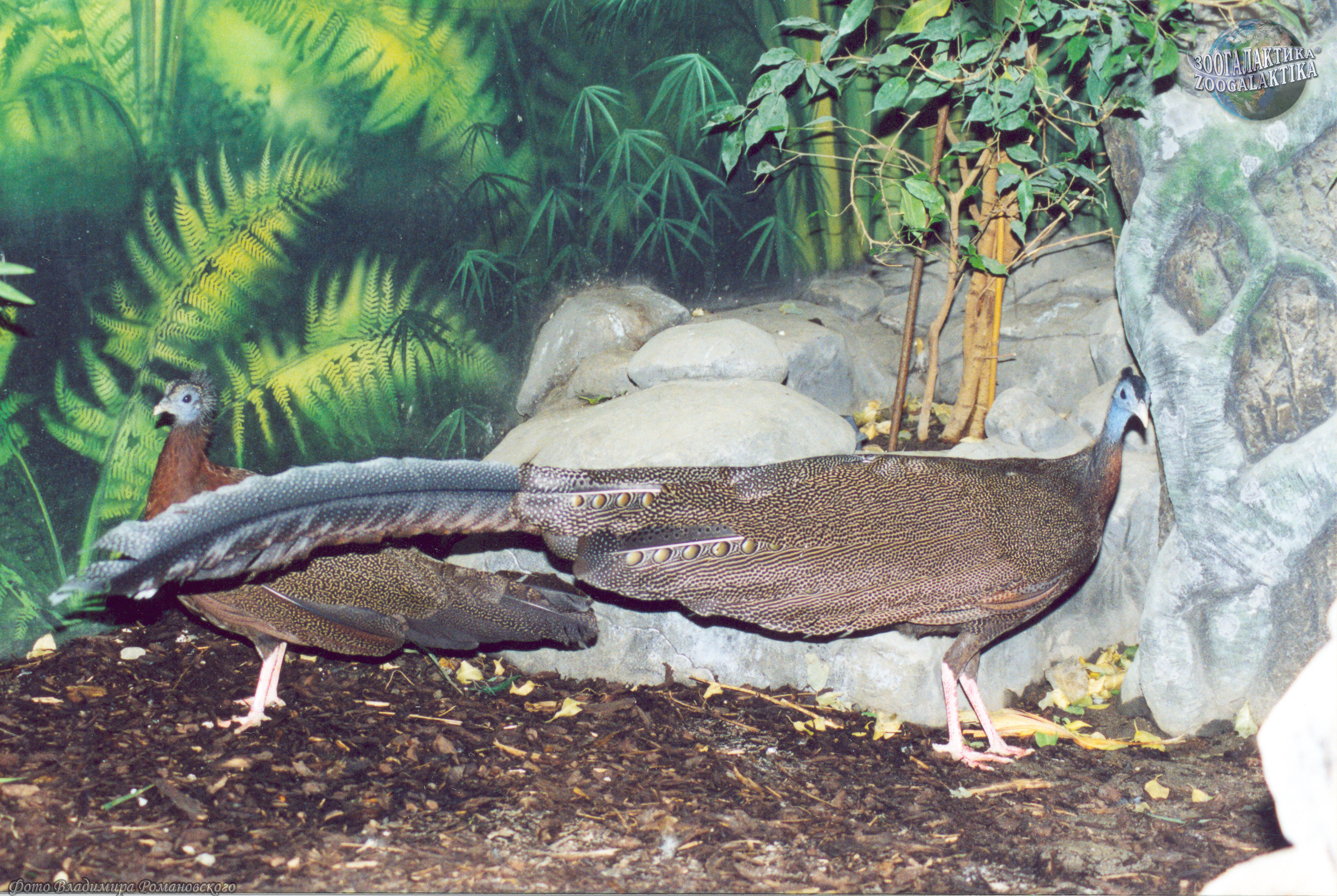 Большой аргус (Argusianus argus) – крупный представитель семейства фазановых, обитающий в Юго-Восточной Азии и Индонезии. По размеру он сходен с павлином: длина тела самца составляет 1,7-2 м (из них центральные рулевые перья — до 1,4 м) при весе 2,5-3 кг. Фазаны-аргусы получили свое название по имени героя древнегреческих мифов, обладателя множества глаз. Дело в том, что второстепенные маховые перья этой птицы очень велики и украшены большими глазчатыми пятнами, похожими на рисунок на “хвосте” павлина. Дополнительный колорит облику большого аргуса прибавляют удлиненные, достигающие почти полутора метров, центральные перья хвоста, да и весь хвост тоже достаточно длинный. Когда самец токует, то украшающие перья на крыльях широко раскрываются и поднимаются над спиной так, что соприкасаются краями, поднимается кверху и хвост. Все эти ухищрения приводят к тому, что голова и тело птицы словно выглядывают из огромного веера изящной окраски. Однако наблюдать в природе эту красивейшую птицу непросто: аргусы живут в труднопроходимых тропических лесах; да еще выбирают совсем уж недоступные участки сомкнутых кустарниковых зарослей.