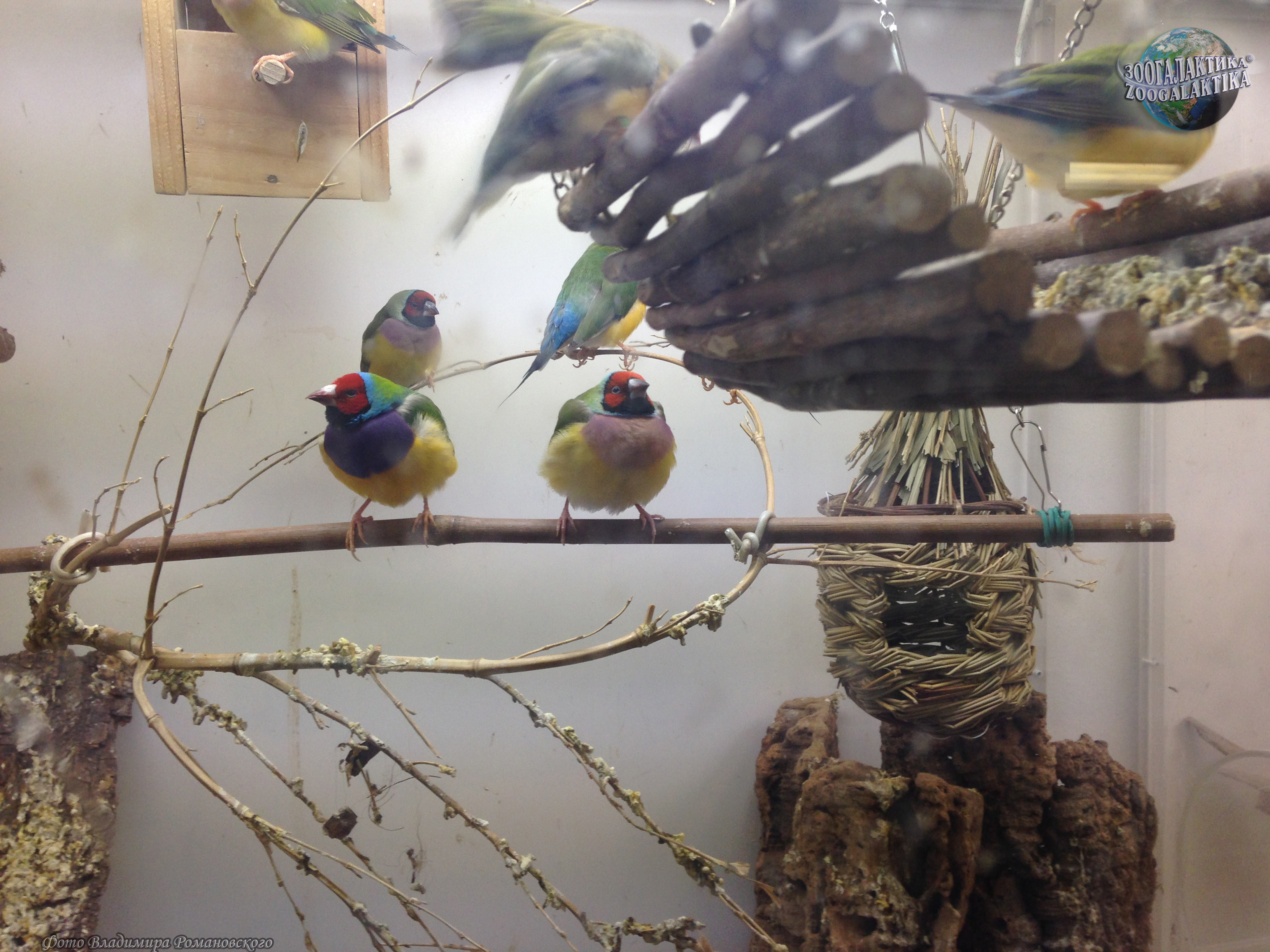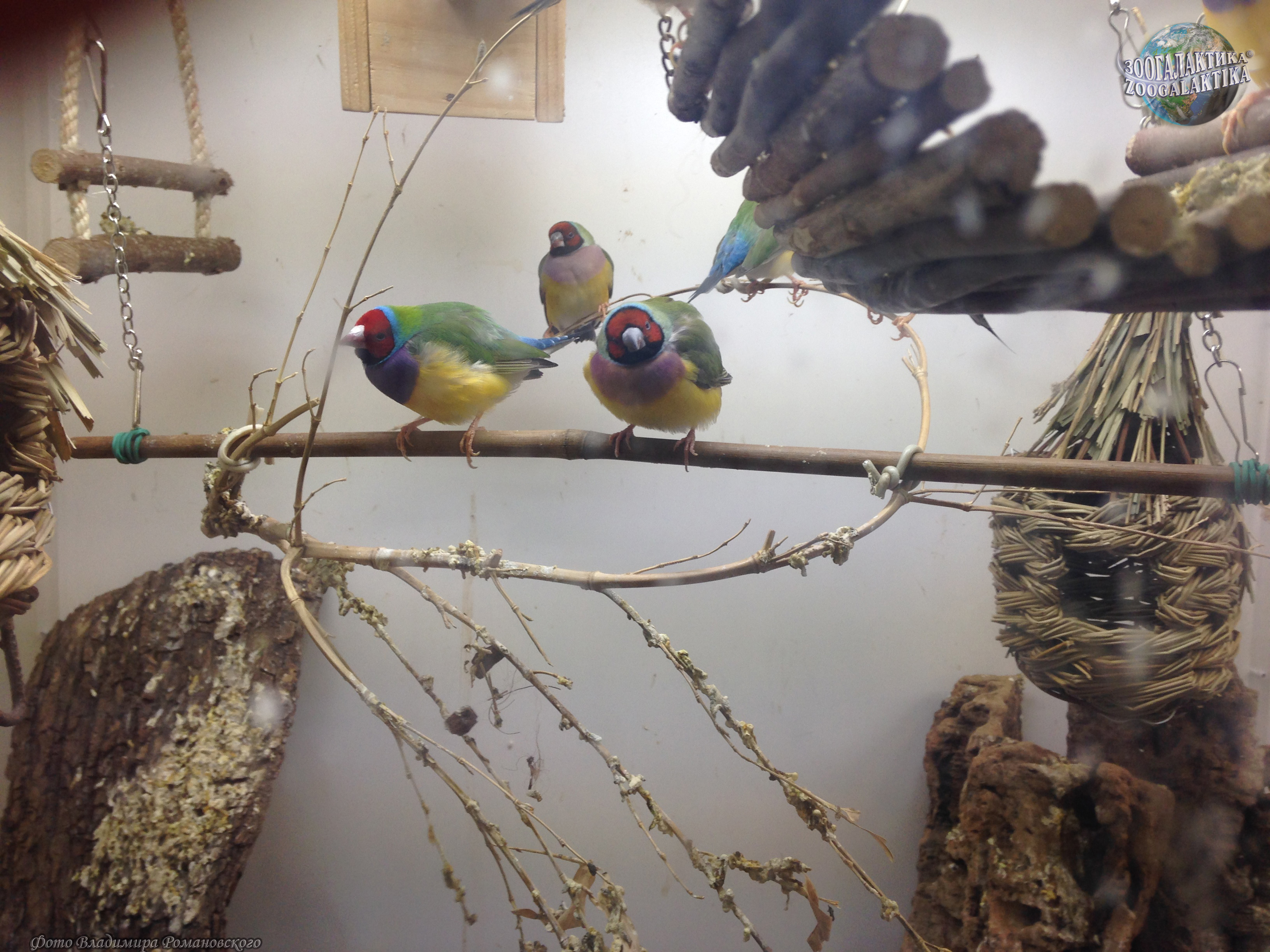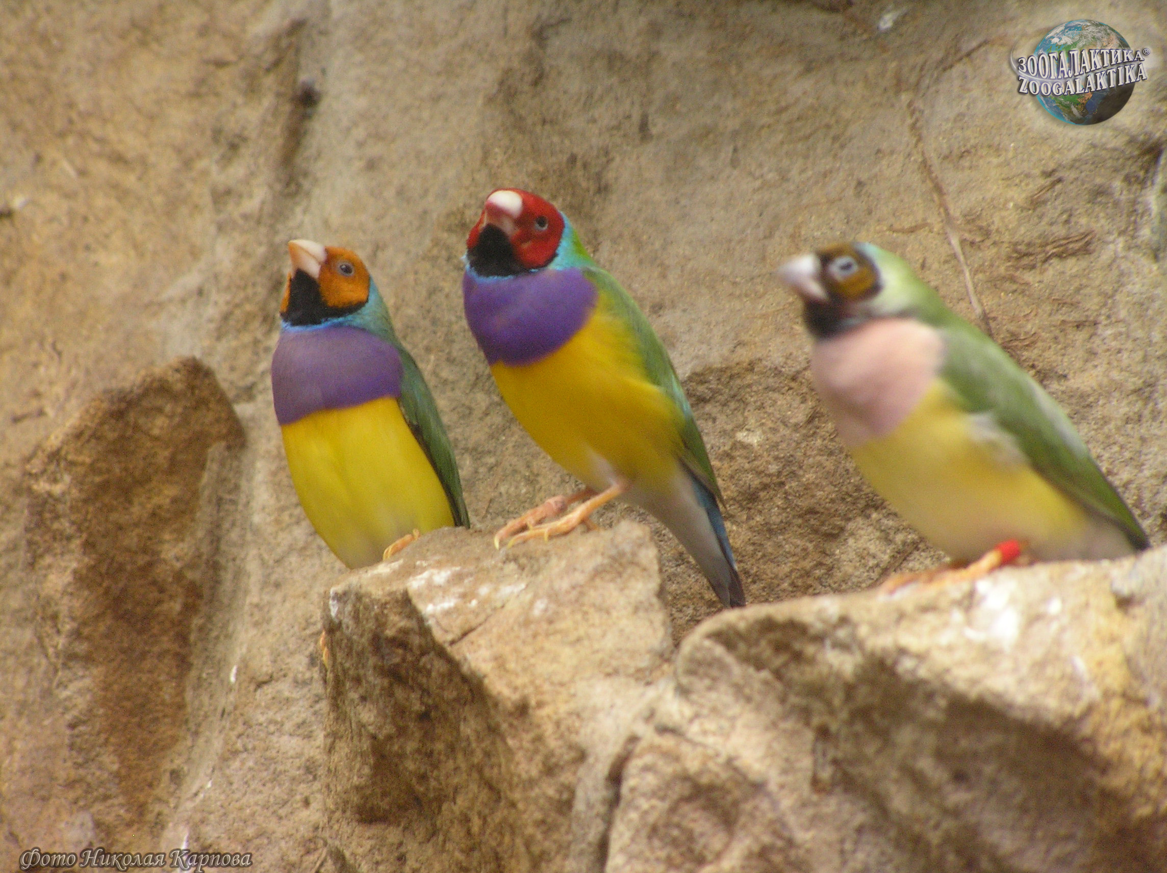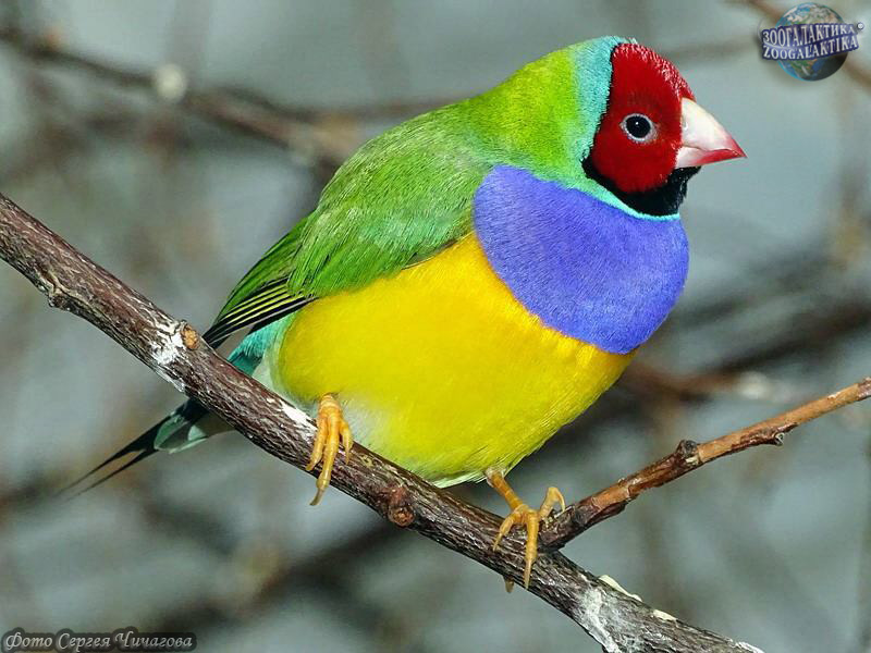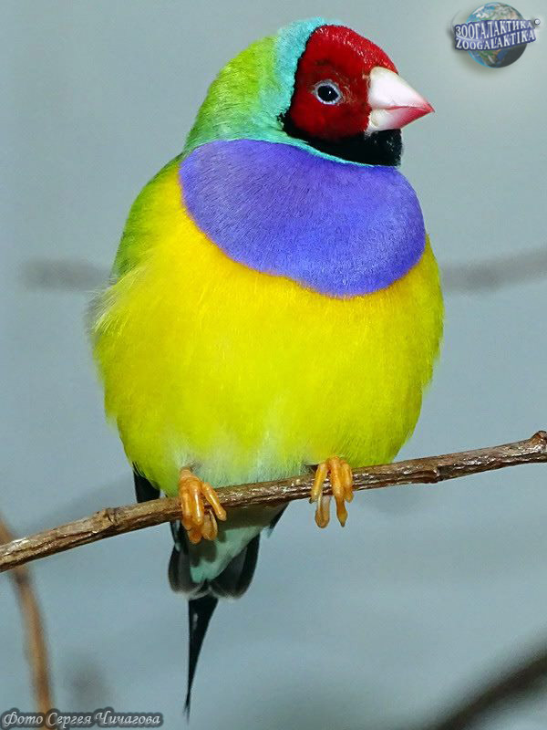 Амадина Гульда (Erythrura gouldiae) - одна из самых ярко окрашенных птиц. Обитают они в Северных регионах Австралии, где встречаются в травянистых местностях с отдельно стоящими деревьями. Амадины обычно вьют свои шарообразные гнезда на деревьях, в кладке у них 4-8 белых яиц. Питаются амадины Гульда семенами трав и беспозвоночными.