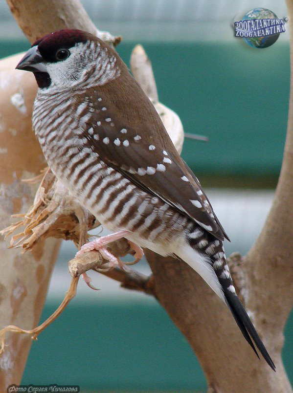 Эти скромно окрашенные птицы нравятся любителям за бойкий характер и выносливость. У самца темно-коричнево-красный лоб, серое темя, а шея и спина коричневые. Верхние кроющие хвоста серо-коричневые с крупными белыми пятнами на концах, надхвостье с несколькими белыми поперечными полосками. Черная уздечка контрастно выглядит на серебристо-белой стороне головы. Оперение в области уха с поперечными коричневыми полосками. Борода и верхняя часть горла черные. Вся нижняя часть корпуса чисто-белая, а на шее и боках равномерно расположены светло-коричневые поперечные полоски. Второстепенные маховые и большие кроющие крыла коричневые с мелкими белыми точками на концах; клюв черный, ноги светло-красные. У самки красное пятно на лбу меньше, чем у самца; борода и горло серо-белые, поперечные полоски на боках несколько уже и менее выражены.