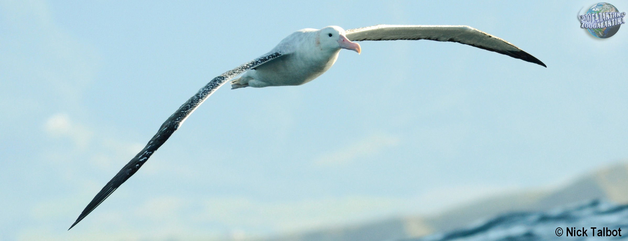 Странствующий альбатрос (Diomedea exulans) – одна из самых крупных летающих птиц – тело у неё достигают длины 120 см, вес взрослой самки – 7-9 кг, самца до 11 кг. Странствующий альбатрос обладают самым большим среди современных птиц размахом крыльев — до 325 см. Рекорд принадлежит старому самцу, пойманному в 1965 г. у берегов Австралии – размах его крыльев составлял 3 м 63 см. Крылья у этой птицы длинные и узкие. Сильные воздушные потоки, возникающие при взаимодействии морских волн и атмосферы, используются альбатросами для парения, поэтому они держатся на границах циклонов и предпочитают избегать штилевой погоды. В безветренные дни или при низкой температуре воздуха птица не поднимается высоко, обычно же она летает на высоте не выше 15 метров. В день альбатрос может пролететь до 1000 км, причем он способен лететь и против ветра.