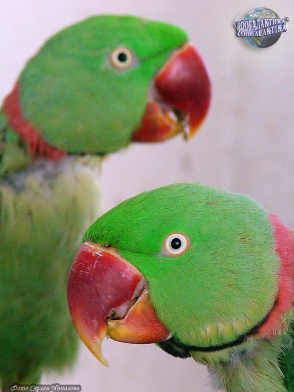 Большой кольчатый, или александрийский, попугай (Psittacula eupatria) - довольно крупный попугай, длина которого достигает 55-58 см, причем более половины приходится на хвост. Это вид - самый крупный попугай среди кольчатых, или ожереловых попугаев. Окраска оперения большого кольчатого попугая зеленая с коричнево- красными пятнами в верхней части крыльев. У самцов имеется черное "кольцо", проходящее от нижней части клюва до середины шеи, продолжение кольца на верхней стороне шеи розовато-красного цвета, часть головы в области этого кольца голубовато-серо-зеленого оттенка. Такое ожерелье появляется у самцов на 3-й год жизни, а самки и молодые птицы не имеют его вовсе. Александрийских попугаев издавна держат как клеточных птиц. Первые упоминания и рисунки с их изображением относятся еще ь временам Древнего Рима. Любители птиц очень ценят их за ласковый нрав и красоту. В результате селекционной работы выведены цветные мутации этого вида: желтая, белая и голубая.