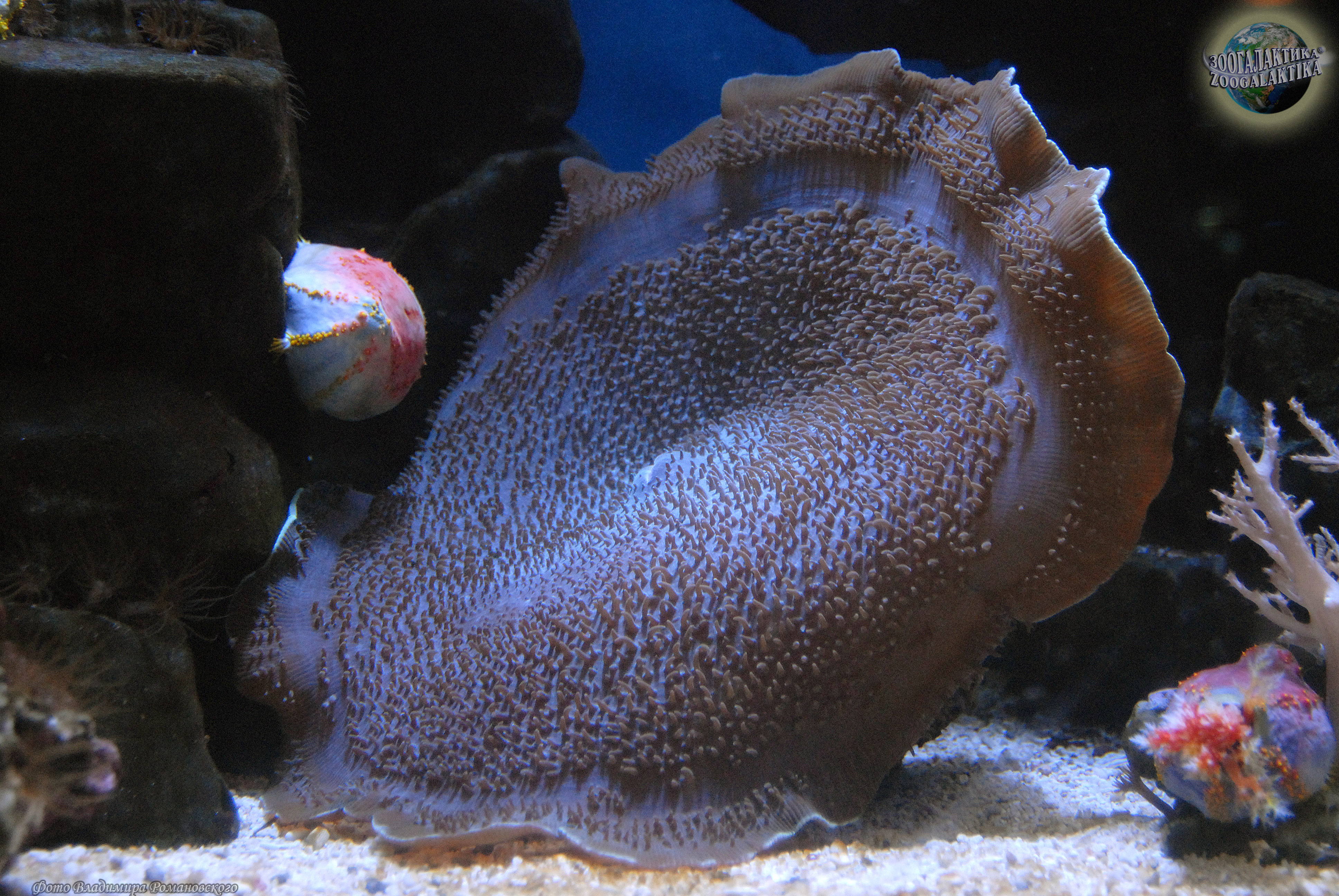 Этих гигантов среди дискоактиний называют "слоновые уши" или "гигантские грибы". Широкий ротовой диск этих актиний покрыт небольшими вытянутыми щупальцами, в центре диска располагается сравнительно крупное ротовое отверстие. Окраска у них очень разнообразная: сиреневая, фиолетовая, зеленая, коричневая и т.д., максимальный размер - до 40 см в диаметре. Распространены слоновые уши в Западной части Тихого океана, в акватории островов Индонезии и на Большом Барьерном Рифе, где населяют мелководные участки коралловых рифов. Держатся «уши» преимущественно на отмерших мадрепоровых кораллах, каменистых участках или реже на песчаном дне. Эти поражающие воображение организмы – хищники. Зоологи предполагают, что они используют одурманивающий запах для привлечения рыб. Когда ничего не подозревающая жертва приближается к полипу вплотную, актиния захватывает ее, смыкая края ротового диска. Ловушка медленно закрывается вокруг рыбы, как бы заключая ее в огромный шар, и у жертвы практически не остается шансов на спасение. Рыба умерщвляются стрекательными клетками, а затем переваривается. Кроме того, значительную часть питательных веществ амплексидискусы получают другим способом: от симбиотических зооксантелл. Однако для нормального роста и развития при содержании в аквариуме им необходимы регулярные подкормки зоопланктоном, мелко нарубленным мясом креветок, моллюсков или рыбы.